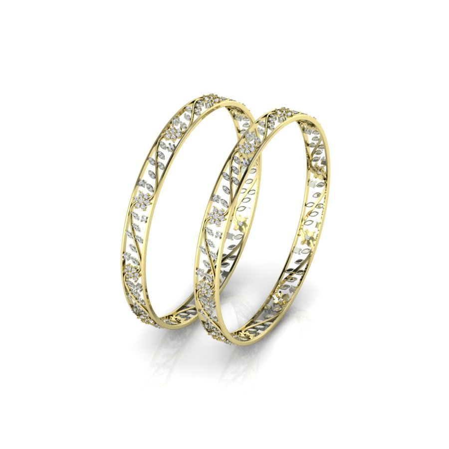 The design features a delicate leaf or vine pattern, giving the bangles an elegant and ornate appearance. The combination of gold with the sparkling stones and open lattice-like design makes them suitable for traditional or formal occasions.