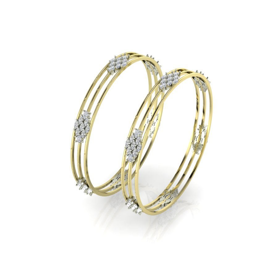 They feature three parallel bands per bangle, adorned with diamond clusters arranged symmetrically around the circumference. The diamonds are set in a floral or geometric pattern, adding a sparkling contrast to the yellow gold. These bangles are likely made of 18K , often worn for special occasions or as part of bridal jewelry.
