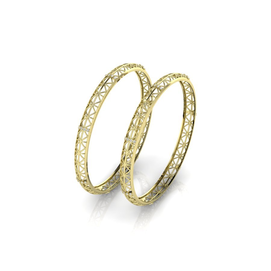 The bangles feature a geometric pattern made up of interconnected triangular shapes, with small sparkling stones (likely diamonds or cubic zirconia) set at regular intervals, enhancing their visual appeal. The design is delicate and symmetrical, giving the bangles a modern yet traditional look, suitable for both everyday wear and special occasions. Let me know if you’d like help identifying the style, cultural significance, or purchasing options for similar jewelry.