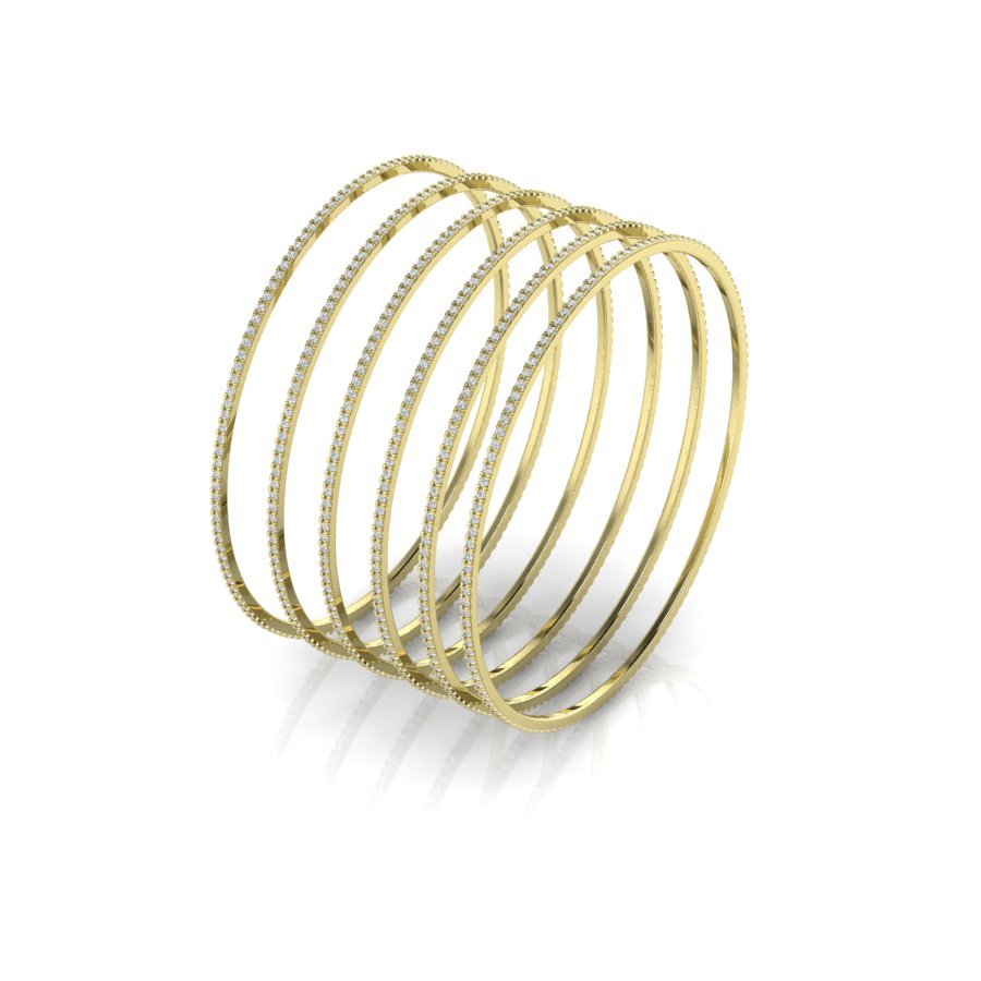 Each bangle is uniformly thin and delicately adorned with small diamonds or diamond-like stones along the outer edge, giving them a sparkling, luxurious appearance. The bangles are arranged in a slightly overlapping pattern, creating a visually appealing and cohesive set.