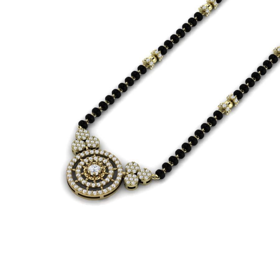 Gold and Diamond Pendant: The centerpiece is ornate, featuring a circular design with concentric rows of diamonds and a larger central diamond, flanked by floral motifs also studded with diamonds.