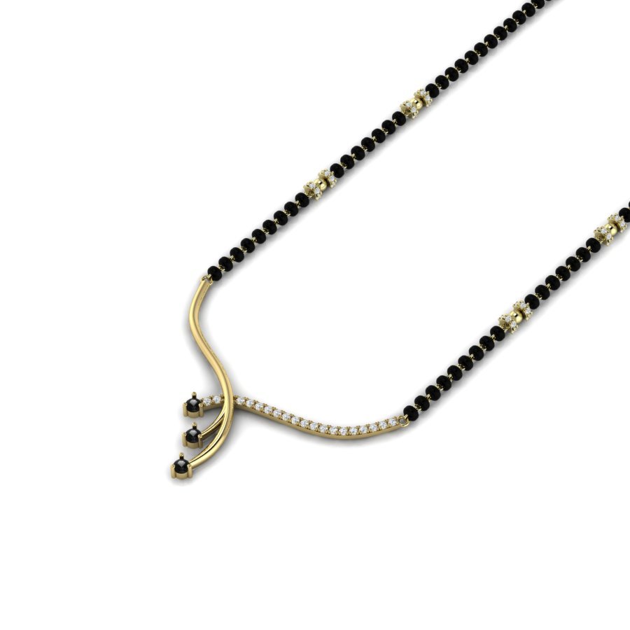 The necklace in the image is a traditional Indian mangalsutra. It features a delicate gold chain interspersed with black beads, which is a characteristic design of mangalsutras symbolizing marital status in Hindu culture. The pendant portion showcases a combination of curved gold design elements with embedded white stones and three black stone droplets, adding elegance and a modern touch to the traditional piece.