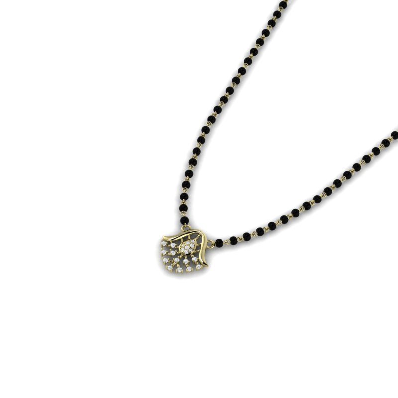 This stunning mangalsutra features a graceful leaf-inspired pendant adorned with sparkling white stones, beautifully set in a gold-toned base. The classic double black-beaded chain adds a traditional touch, making it perfect for daily wear or special occasions. A timeless symbol of love and elegance, crafted to complement both ethnic and modern outfits.