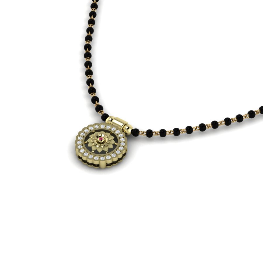 It features a round, gold-tone pendant with a floral motif at the center. The flower has a small red stone at its core, surrounded by petals in a layered design. Around the floral centerpiece is a ring of sparkling white stones, giving it an elegant and radiant finish. The pendant is attached to a traditional black and gold beaded mangalsutra chain, which enhances its cultural charm while maintaining a modern touch.